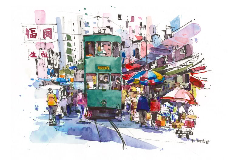 Original ink and watercolour painting of Chun Yeung Street Market, in North Point, Hong Kong.
